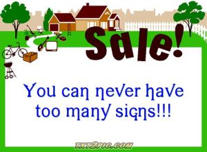 - Put a sign at every possibly intersection, on every possible route to your house from all the main roads in your area. We used to live on a very short, rather hidden street and usually put up at least 12 signs. Some customers even told us that they had fun following the signs to the sale. If you live on a well-known street, you won’t need as many. Don’t underestimate the importance of signs!