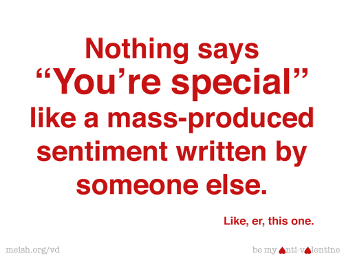 And, it wouldn’t be Anti-Valentine’s Day without mentioning Meish.org, the true home of the holiday. They have loads of funny cards like this one.