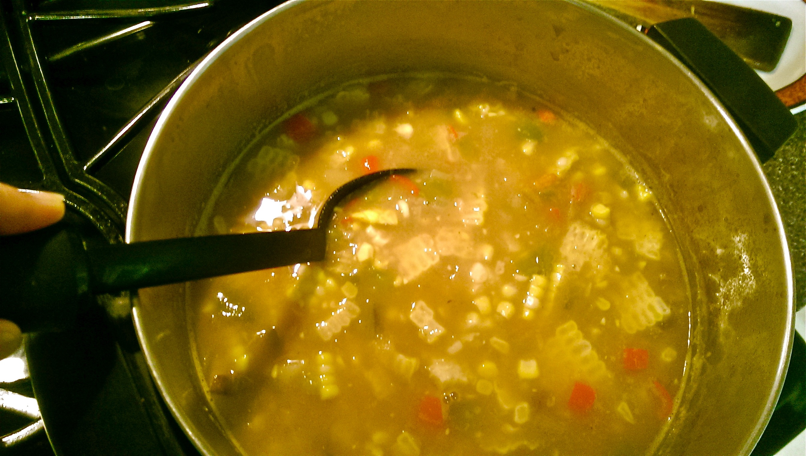 If I wanted a thicker soup, this is when I would mix a couple tablespoons of flour and milk to form a paste, bring the soup to a boil again and gradually stir in flour/milk paste until the soup is thick enough to make me happy. Or I might cheat and stir in some instant mashed potatoes (definitely not fresh or from the garden, but it’s quick).
